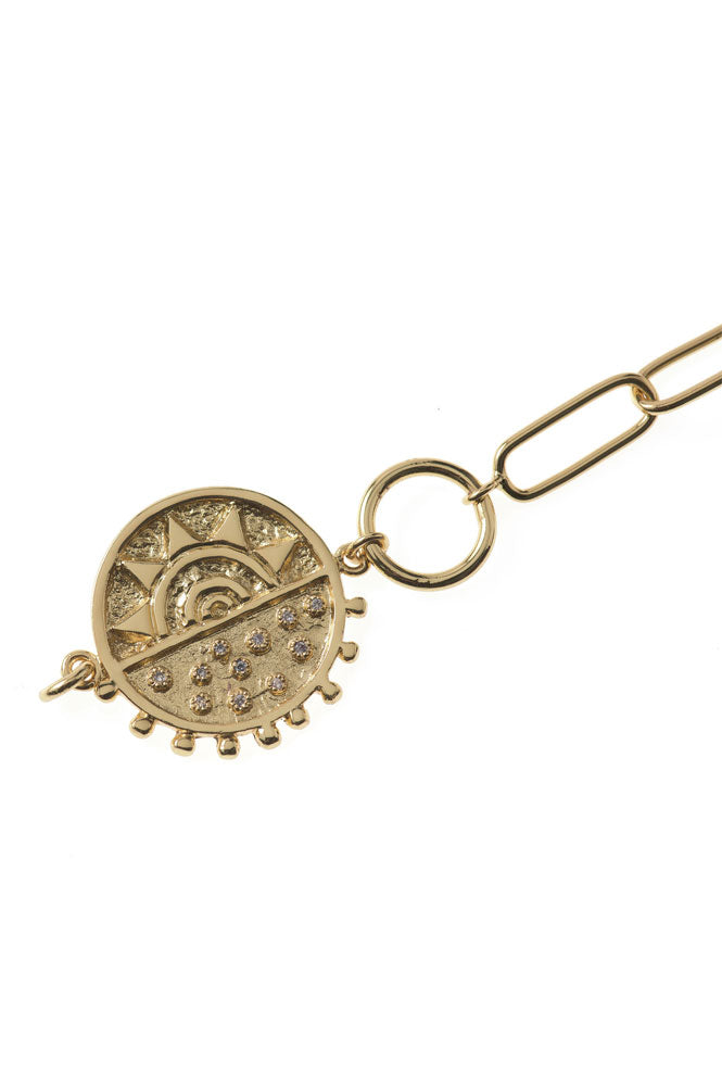 Pendant in gold plated silver with zircons. Chain in gold plated brass. 24 karats